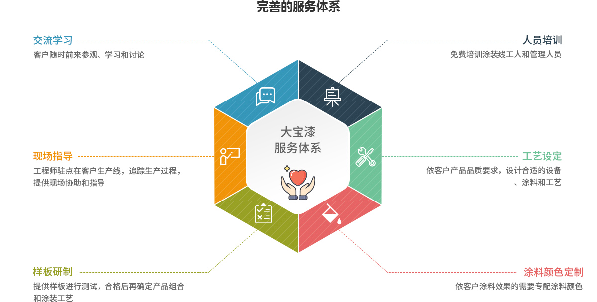 同時,大寶漆還專門指派熟悉產品施工及產品應用的工程服務人員,長期進駐服務網點,為客戶提供點對點式專業服務,包括調色打板、樣品制作、駐廠指導、問題解決、人員培訓、售后服務等,并可在24小時內趕赴現場給予客戶專業的技術指導服務。