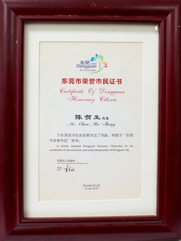 2016年1月12日,第五屆“東莞市榮譽市民”授榮儀式在會展國際大酒店隆重舉行,東莞大寶化工制品有限公司董事長陳賀生等45人獲“東莞市榮譽市民”稱號。