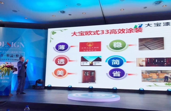 涂料作為木器產(chǎn)業(yè)鏈的下游產(chǎn)業(yè),與家具行業(yè)有著天然的聯(lián)系。作為青木大講堂戰(zhàn)略合作伙伴、木制品涂裝工藝顧問,大寶漆不負(fù)所望,為大會帶去了“大寶漆定制家具涂裝解決方案”即大寶歐式涂裝三三專案。黃文敏高專從大寶漆的特點(diǎn)與優(yōu)勢入手,突出了歐式涂裝所具備的“薄、透、美、穩(wěn)、簡、省”等特點(diǎn)。