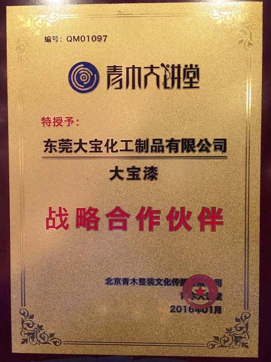東莞大寶化工葉子琛執(zhí)行經(jīng)理等代表大寶漆應(yīng)邀參加大會,東莞大寶化工黃文敏高專向大會作“歐式工藝,創(chuàng)新價(jià)值”的主題演講,受到大會的關(guān)注,同時(shí)大寶漆成為青木整裝“戰(zhàn)略合作伙伴”,繼2015年后大寶漆再次榮膺青木大講堂“木制品涂料工藝榮譽(yù)顧問”。
