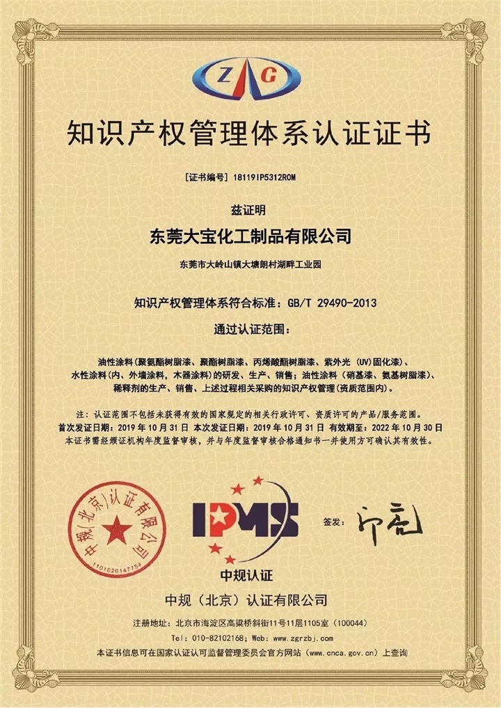 2019年10月31日,東莞大寶化工順利通過GB/T29490-2013知識產權管理體系認證,獲得中規(北京)認證有限公司頒發的認證證書。通過認證范圍包括:油性涂料(聚氨酯樹脂漆、聚酯樹脂漆、丙烯酸酯樹脂漆、紫外光(UV)固化漆)、水性涂料(內、外墻涂料木器涂料)的研發、生產、銷售;油性涂料(硝基漆、氨基樹脂漆)、稀釋劑的生產、銷售等涉及的知識產權管理。
