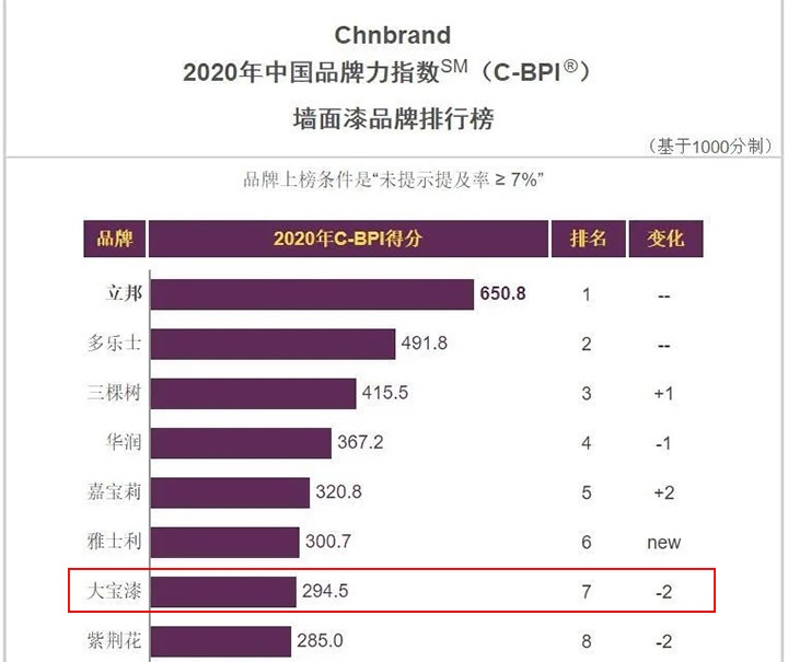2020年中國品牌力指數權威發布,大寶漆再次上榜