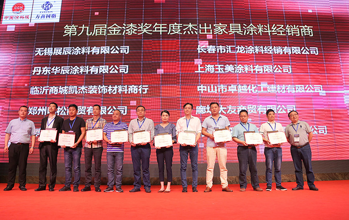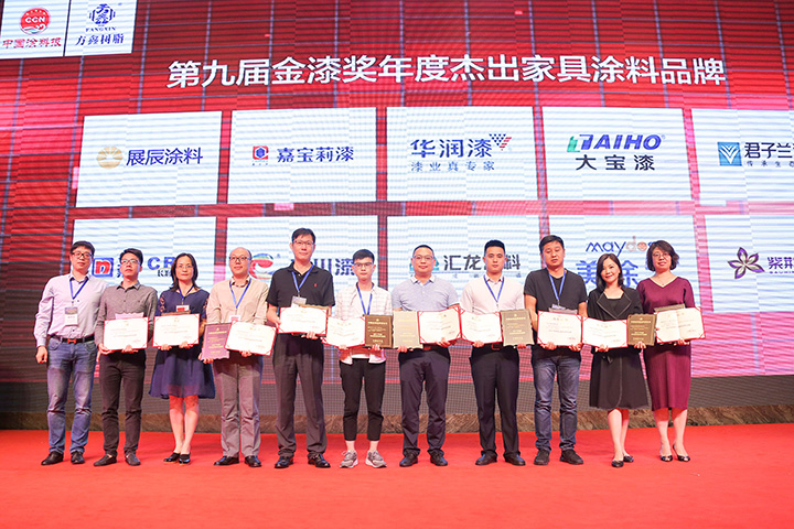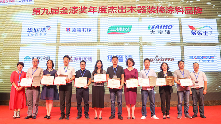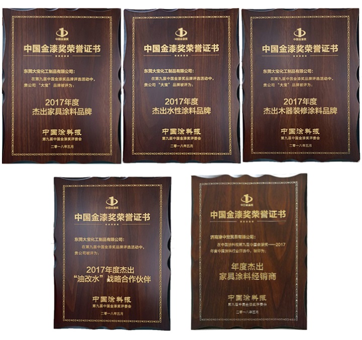 作為民族涂料品牌,大寶漆在金漆獎頒獎典禮斬獲2017年度“杰出木器裝修涂料品牌”、“杰出家具涂料品牌”、“杰出水性涂料品牌”、“杰出油改水戰略合作合伴”等四項殊榮。同時,大寶漆山東經銷商濟南漆中寶貿易有限公司獲得2017年度杰出家具涂料經銷商獎項。